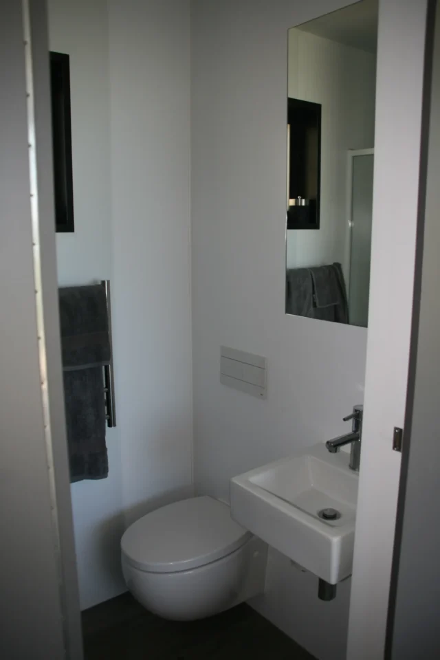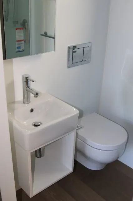 Full bathroom incl. acrylic shower, wall-hung toilet and basin.