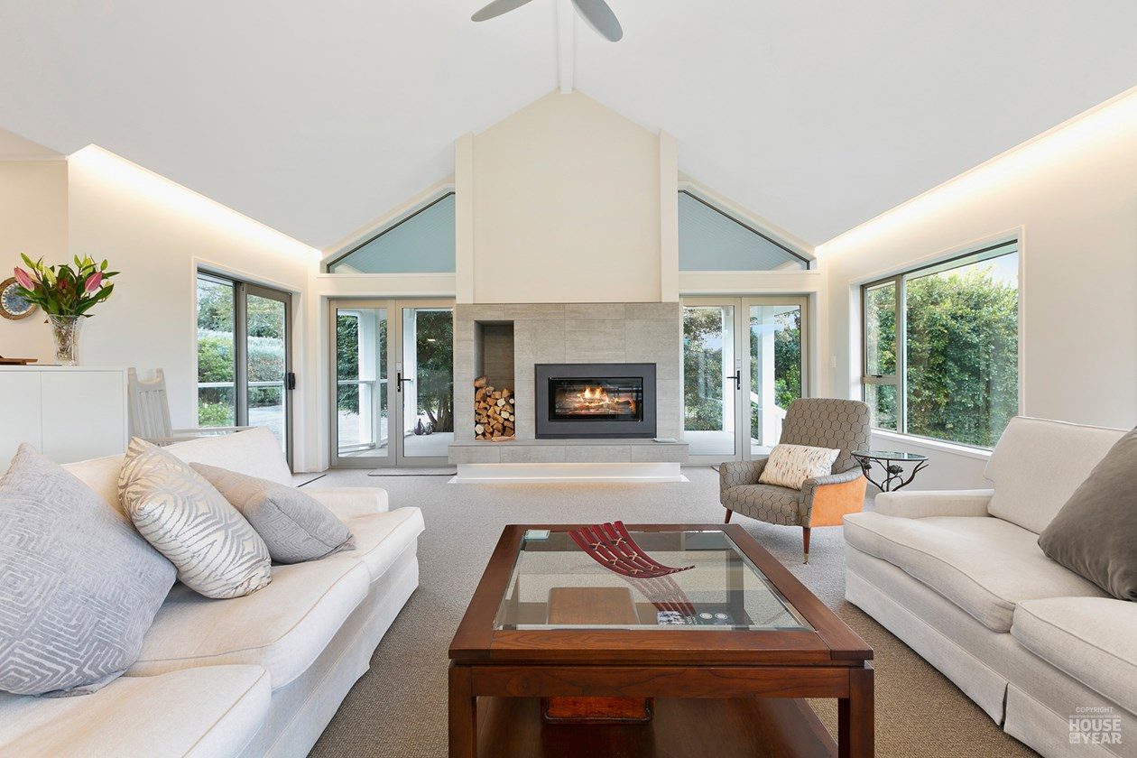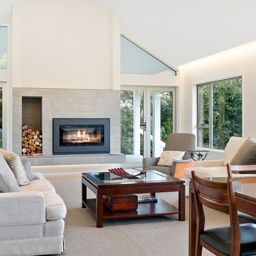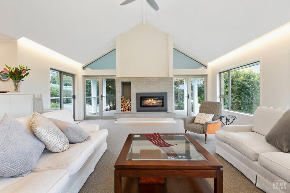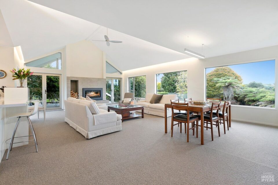 The new entry foyer provides a welcoming transition into the open-plan living zone, where the kitchen, dining area, lounge, and library come together seamlessly. Overhead, cathedral ceilings add a sense of grandeur, while a wood fire keeps the space warm and inviting.