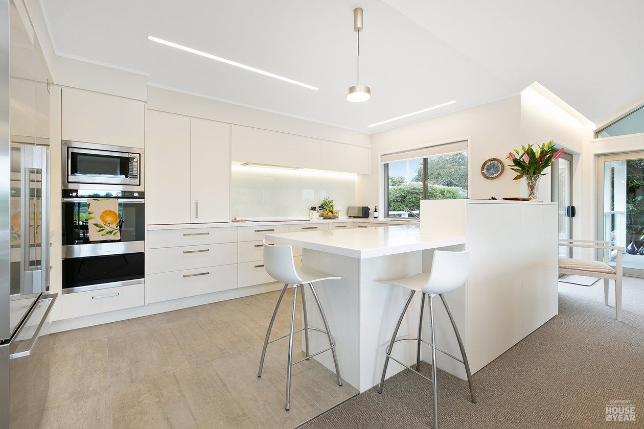 Expansive floor-to-ceiling windows frame picturesque garden and estuary views, drawing natural light deep into the home. French doors lead to a north-facing covered living area, where nature and architecture exist in perfect harmony.