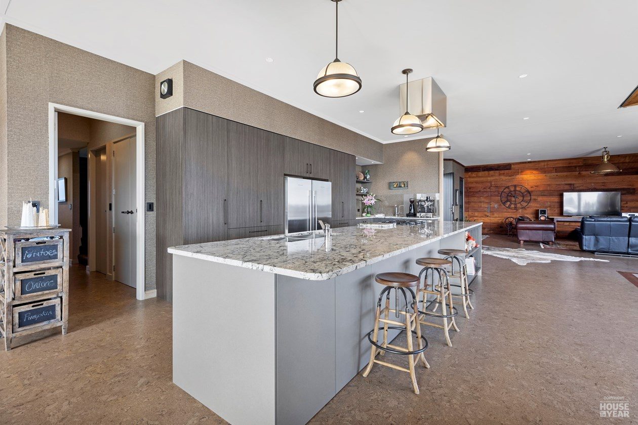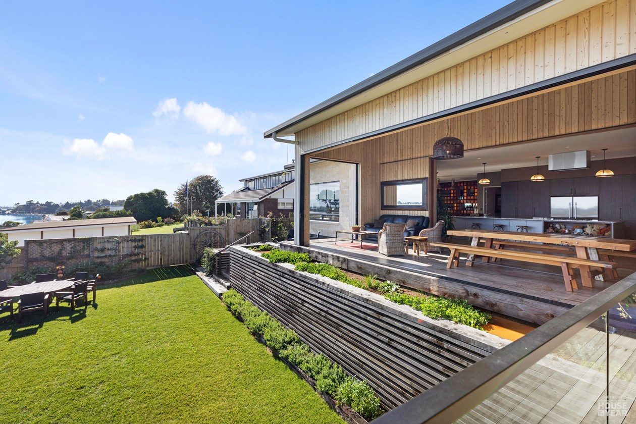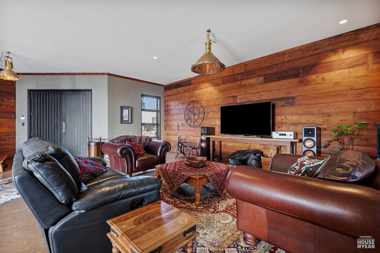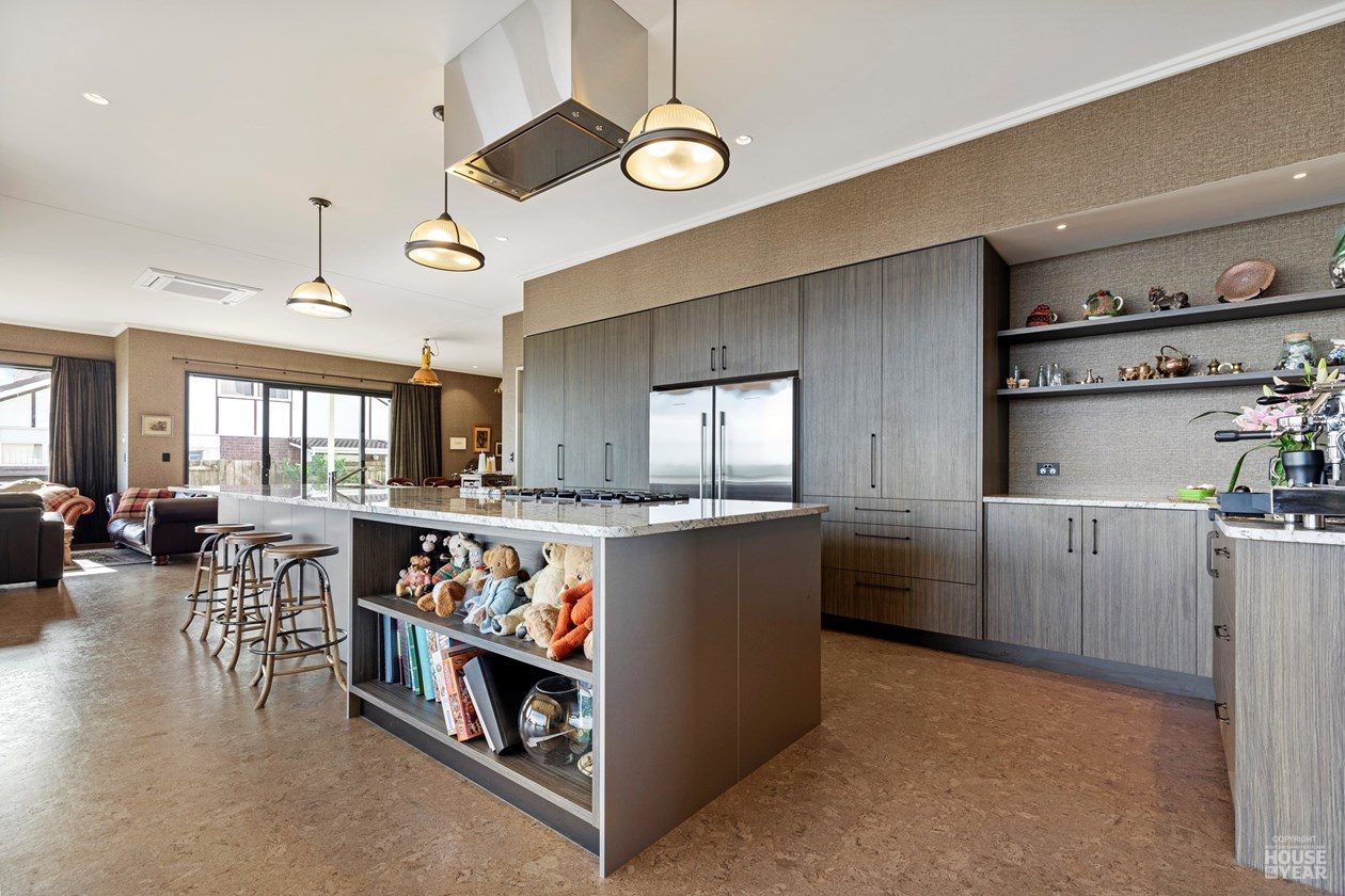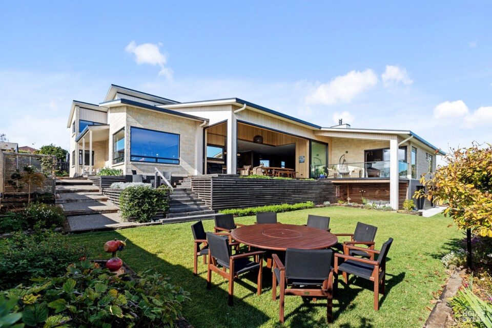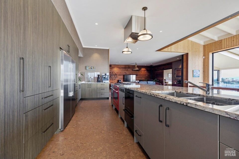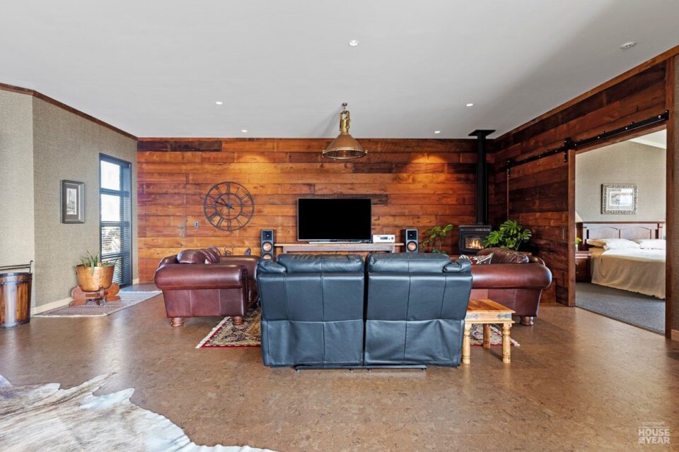 The 500sqm home cascades down a contoured site and includes a basement workshop, three bathrooms, an office, three living zones, and four bedrooms, including a luxurious main suite. Additional amenities include a laundry, double garage, motorhome garage, and a storeroom. A 4.8m island is the centerpiece of the sleek kitchen, which features granite benchtops and velvet-finish cabinets. On the exterior, rumble brick and Japanese cedar provide texture, while entrance pillars with coreten steel and redwood announce your arrival. Kwila decks off the main bedroom and formal dining area, rustic steps, and a raised planter masking a water tank are well-considered additions.