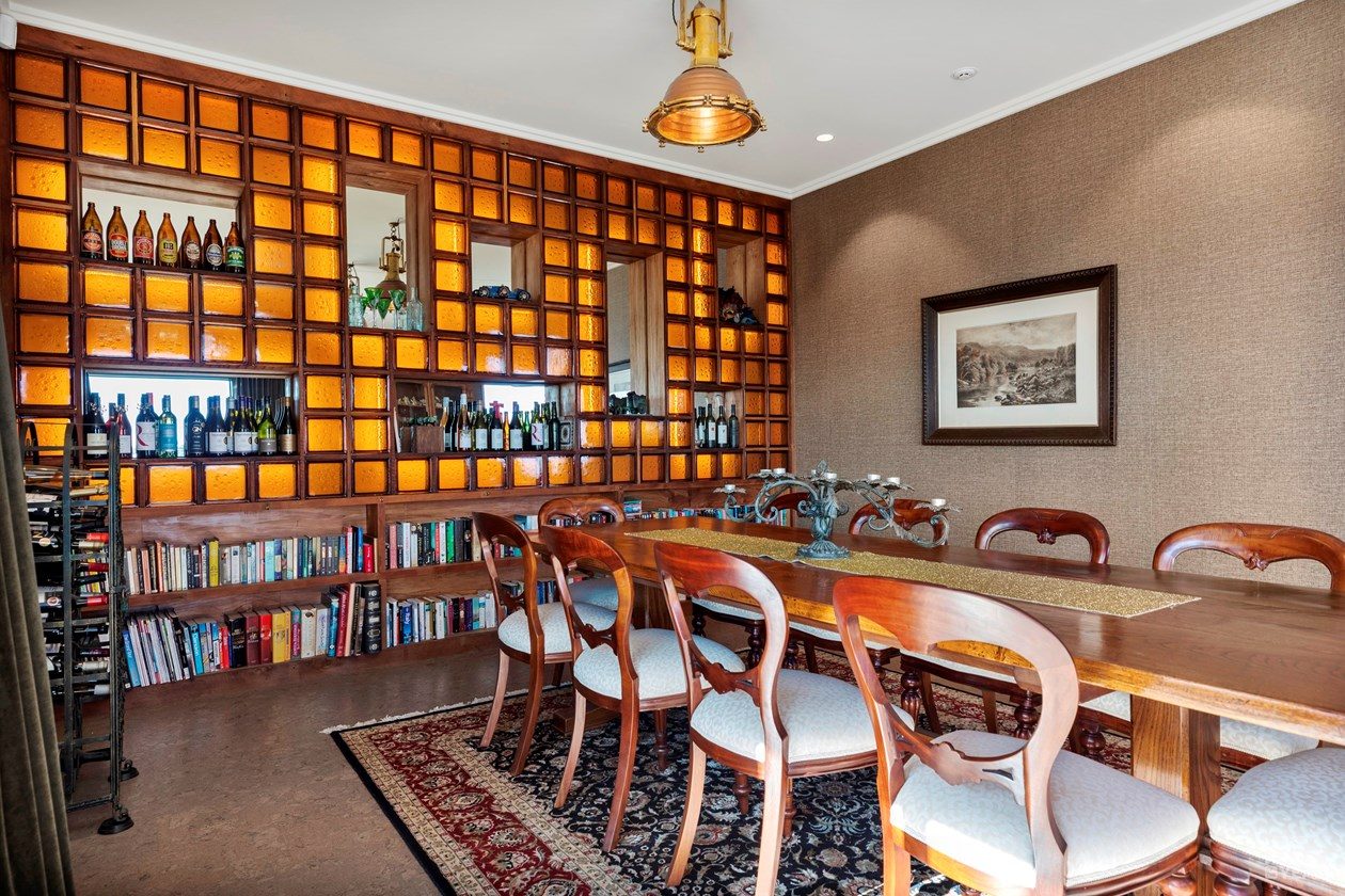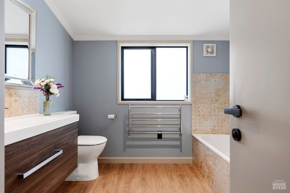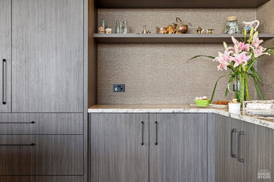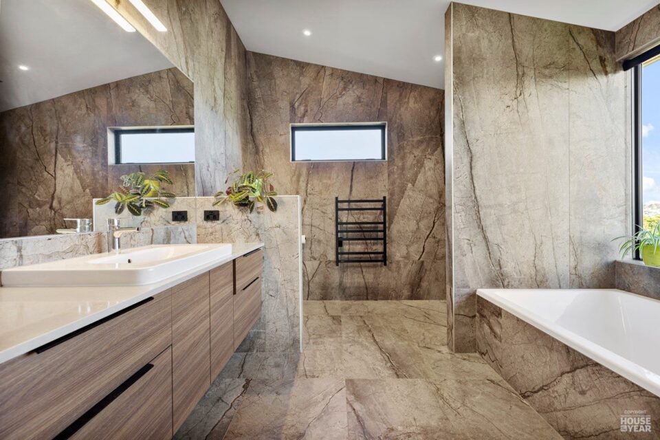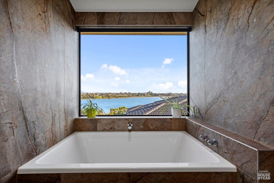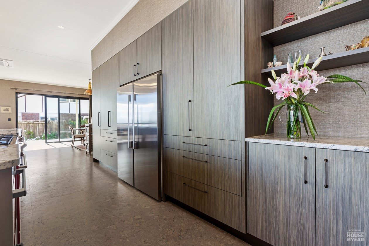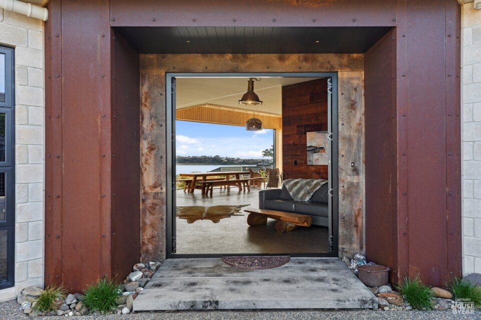 The 500sqm home cascades down a contoured site and includes a basement workshop, three bathrooms, an office, three living zones, and four bedrooms, including a luxurious main suite. Additional amenities include a laundry, double garage, motorhome garage, and a storeroom. A 4.8m island is the centerpiece of the sleek kitchen, which features granite benchtops and velvet-finish cabinets. On the exterior, rumble brick and Japanese cedar provide texture, while entrance pillars with coreten steel and redwood announce your arrival. Kwila decks off the main bedroom and formal dining area, rustic steps, and a raised planter masking a water tank are well-considered additions.
