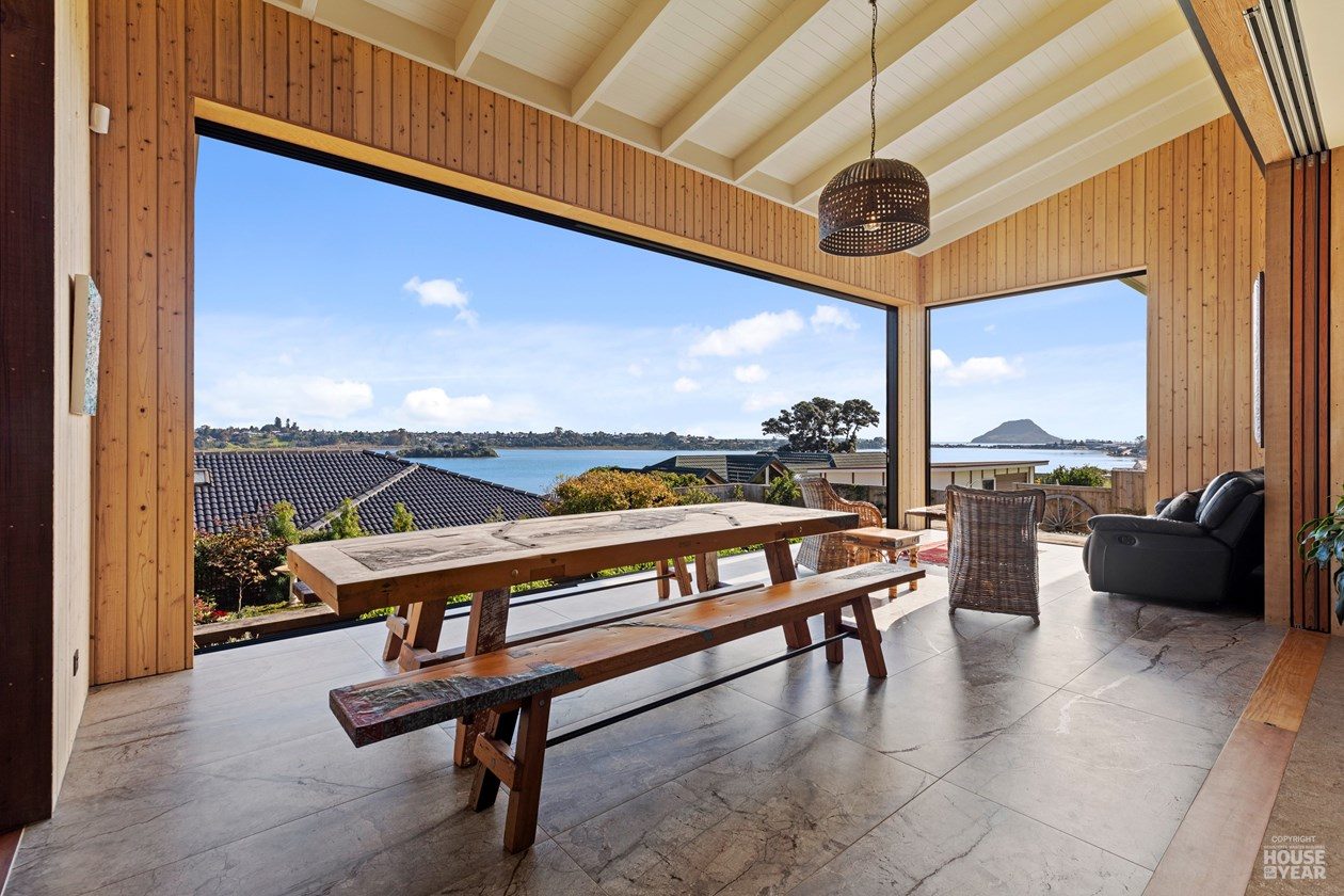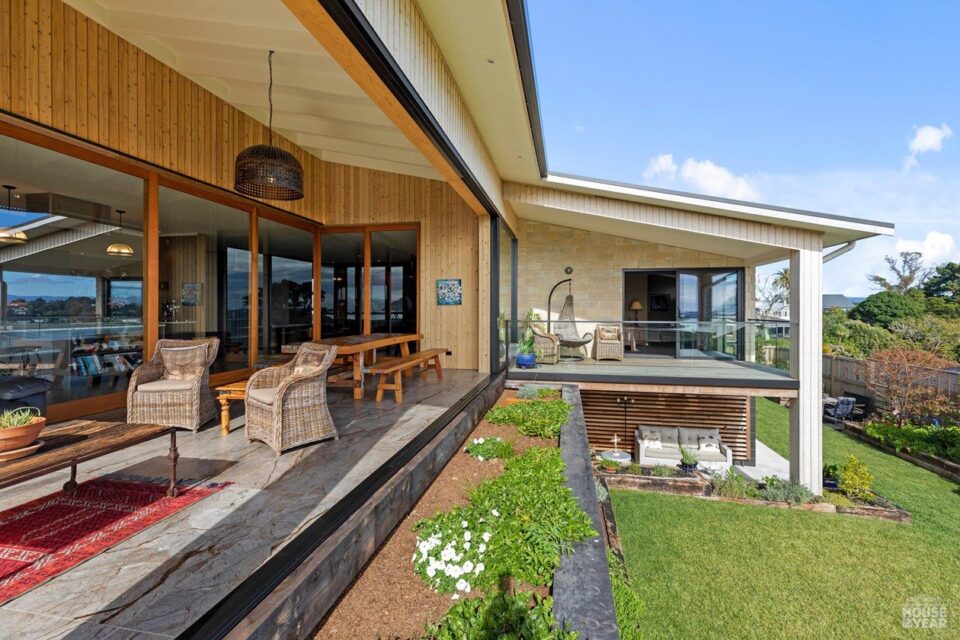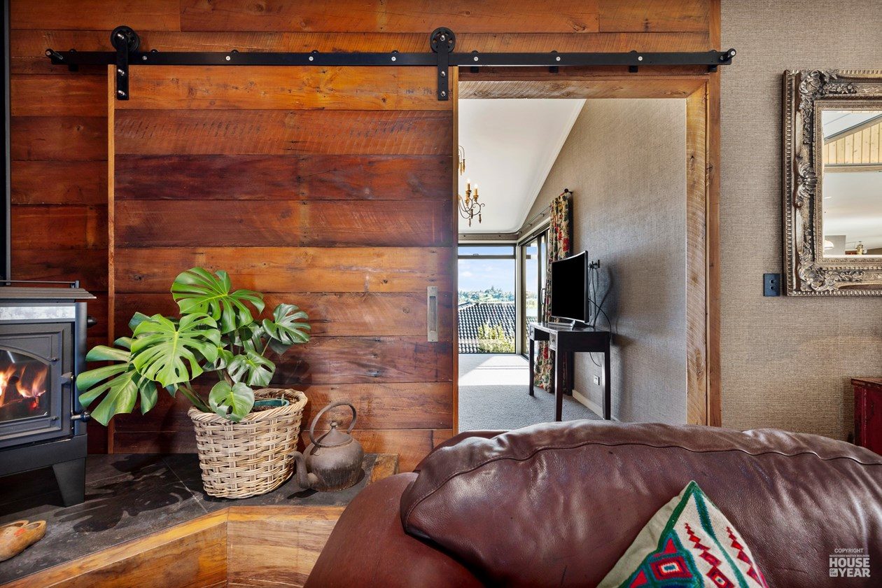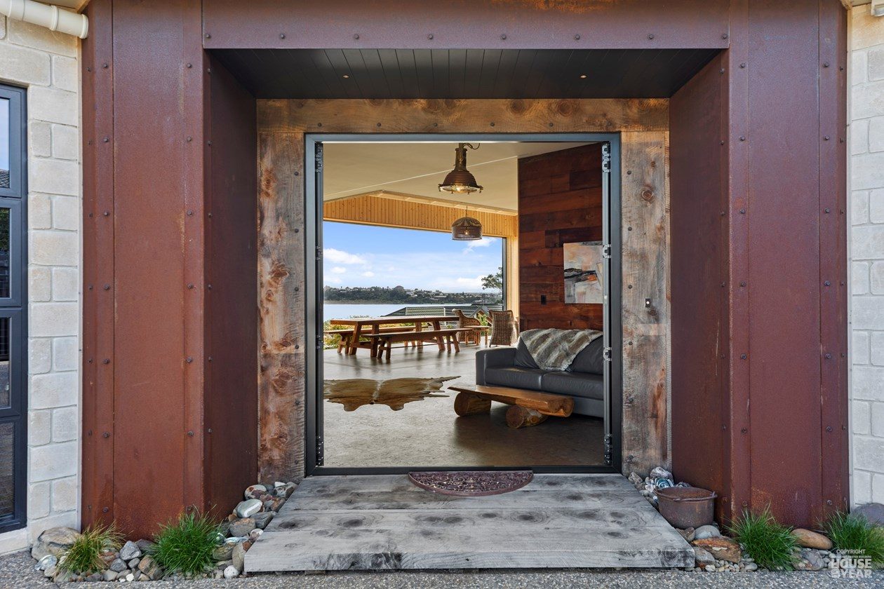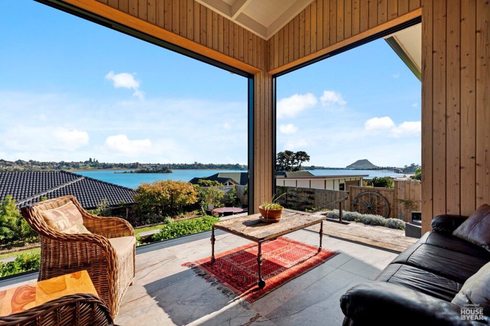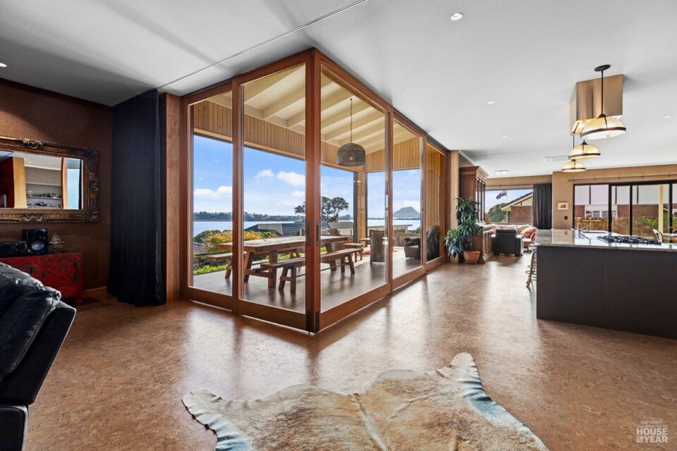 Brand-new materials dovetail with recycled timbers and fittings in this expansive home built over three levels. The finishes—wallpaper, cork tiles, wool carpets, and timber—were chosen to cohesively link with the owners’ furnishings and decor. Architectural sliders open up the living space to the west and north, leading to an outdoor room with a raking ceiling and Japanese cedar walls. This aspect of the home is reminiscent of mid-century design and frames all-encompassing vistas of the harbour, Mauao, and the Kaimai Range.