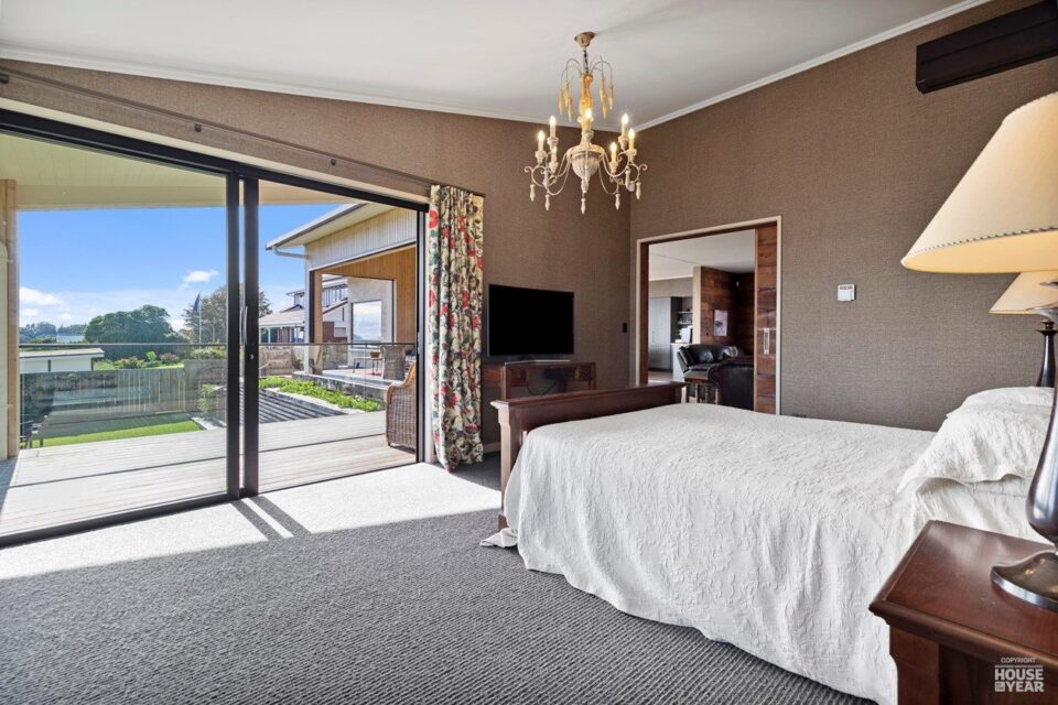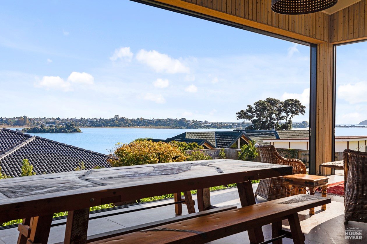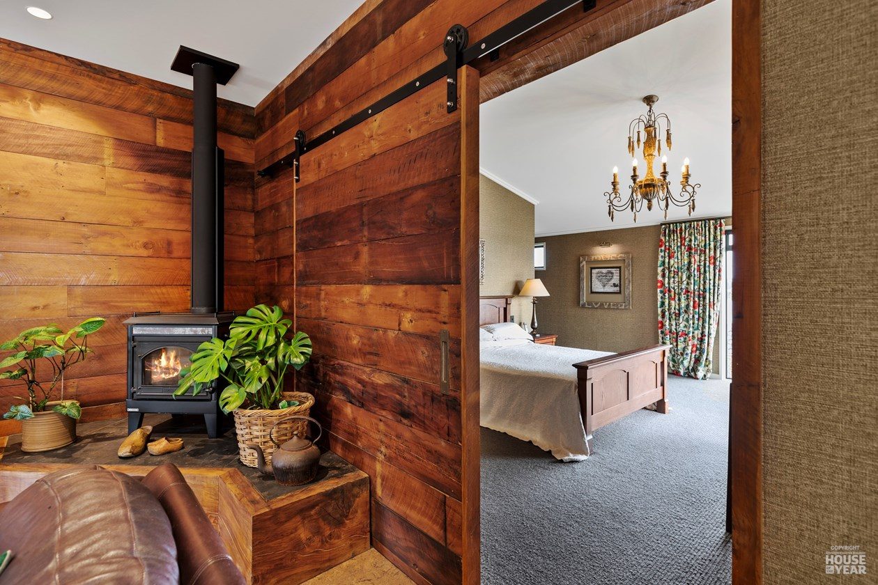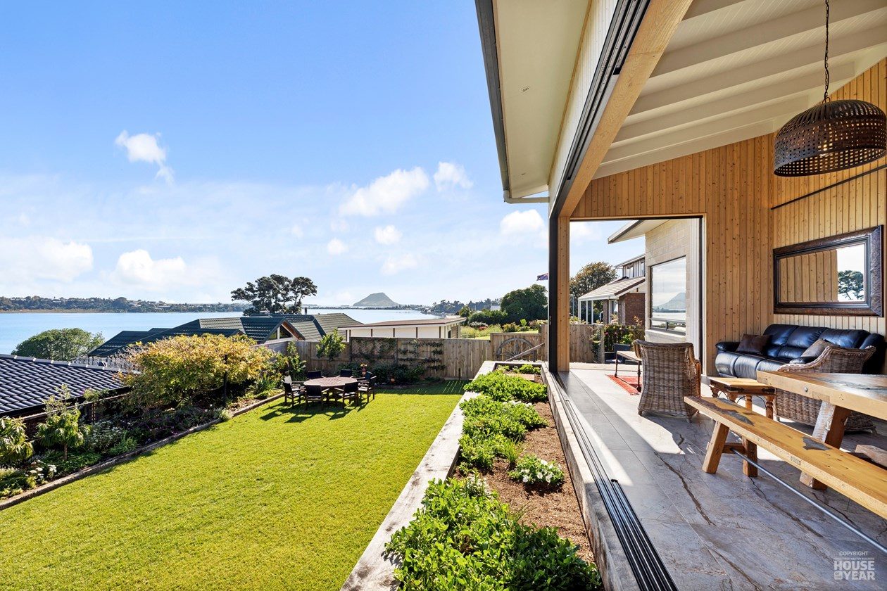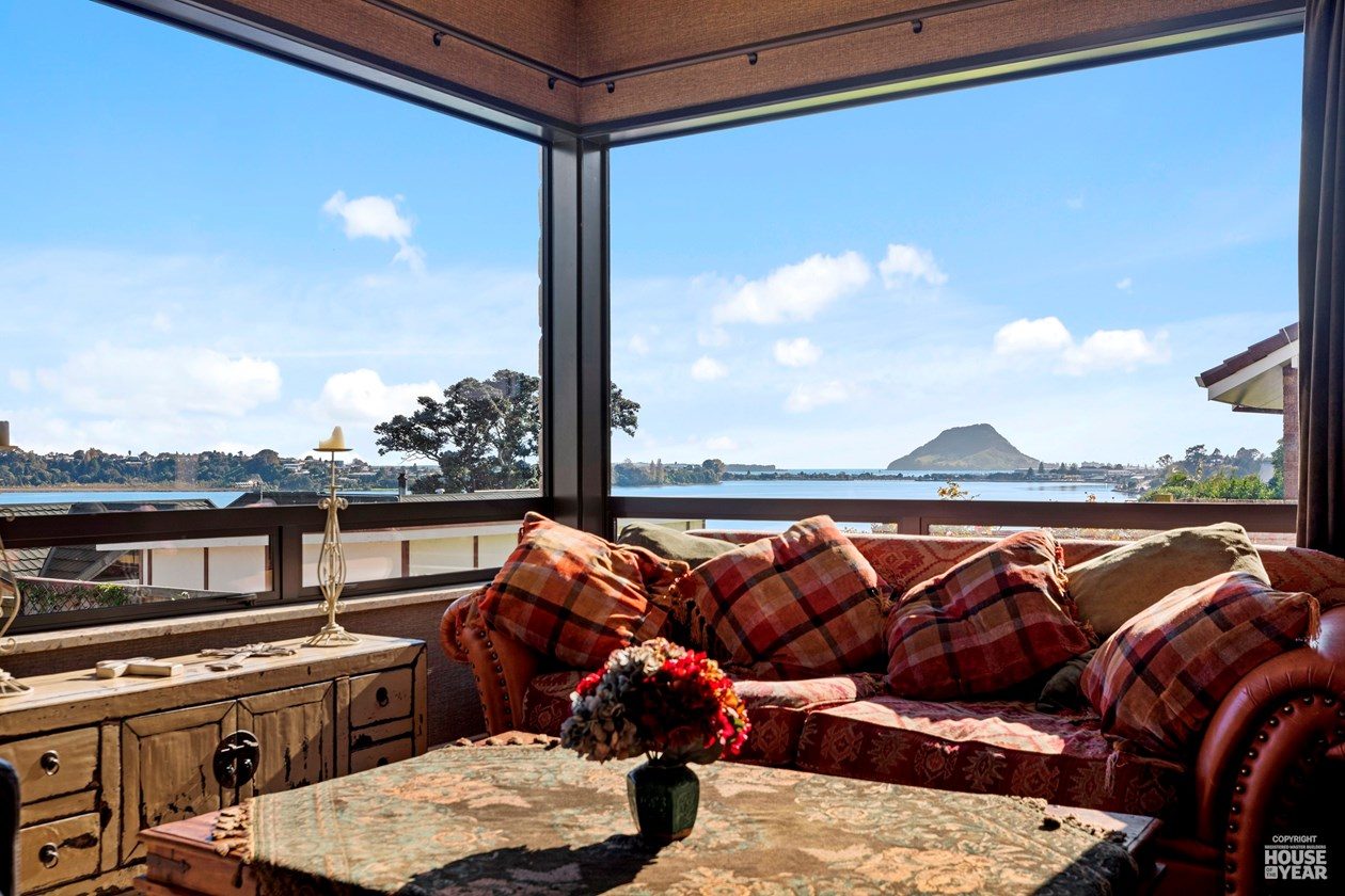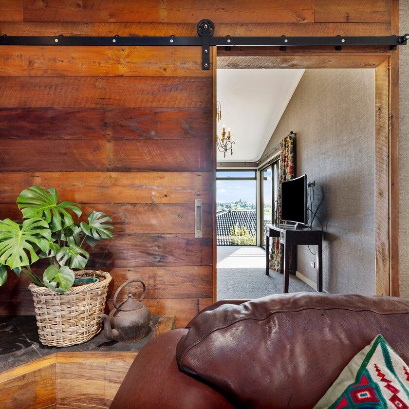 Brand-new materials dovetail with recycled timbers and fittings in this expansive home built over three levels. The finishes—wallpaper, cork tiles, wool carpets, and timber—were chosen to cohesively link with the owners’ furnishings and decor. Architectural sliders open up the living space to the west and north, leading to an outdoor room with a raking ceiling and Japanese cedar walls. This aspect of the home is reminiscent of mid-century design and frames all-encompassing vistas of the harbour, Mauao, and the Kaimai Range.