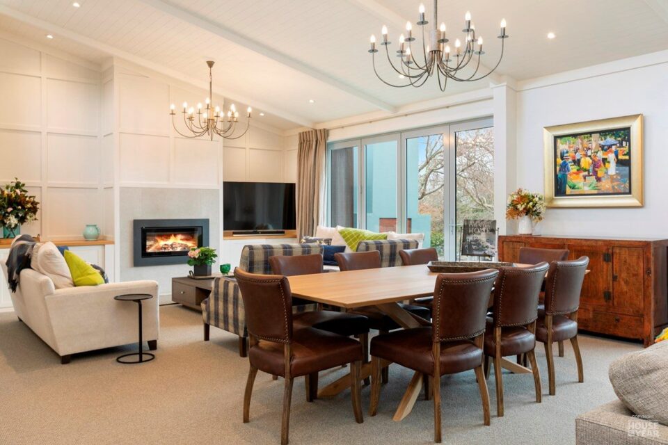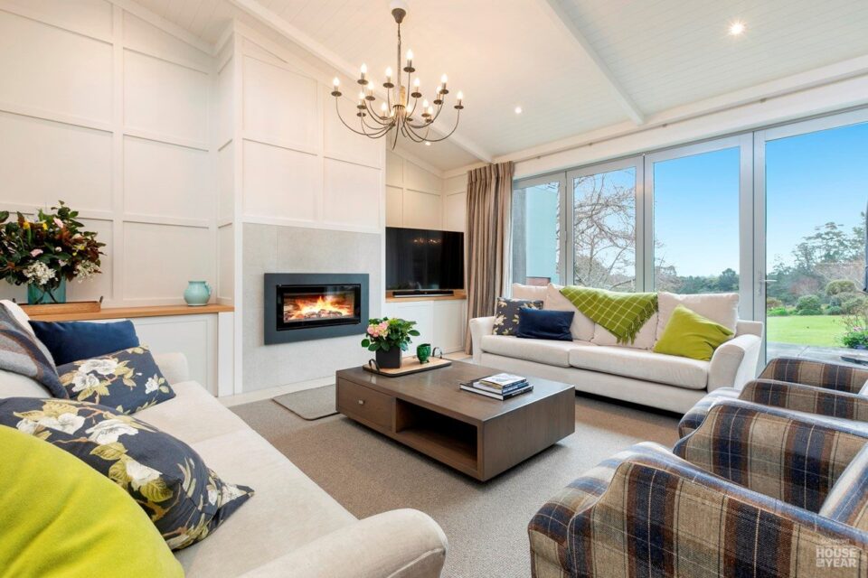 Clerestory windows flood the space with natural light, while large bifold doors open onto the gardens, dissolving the boundary between indoors and outdoors. The Stovax wood fire, surrounded by batten detailing and built-in cabinetry, anchors the space with warmth and character.
