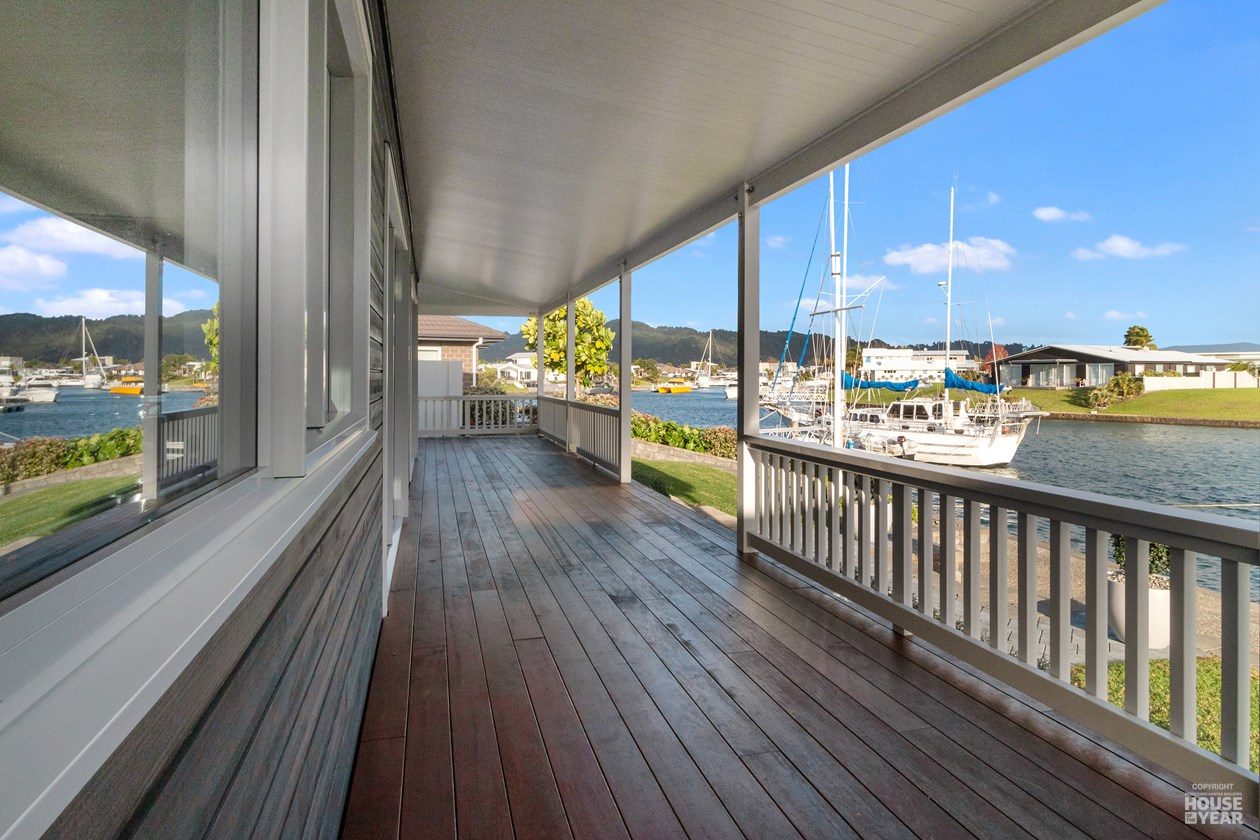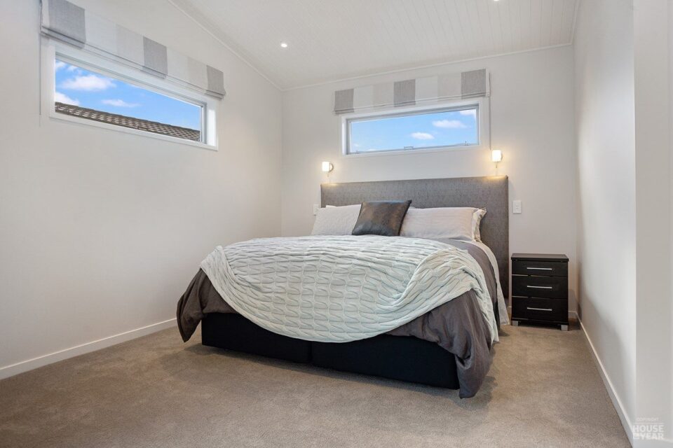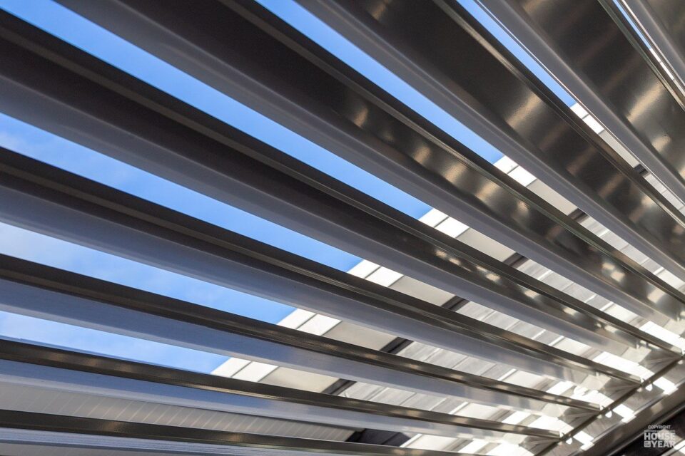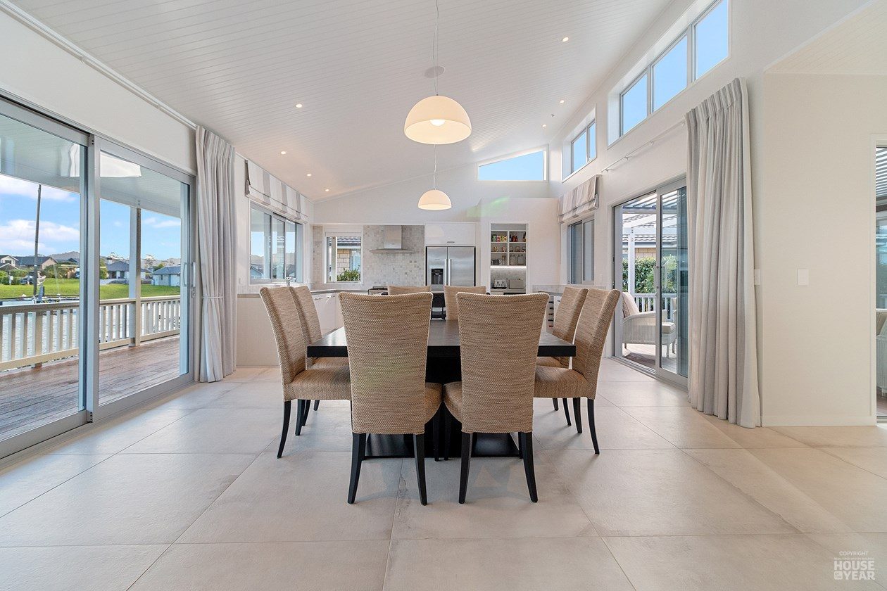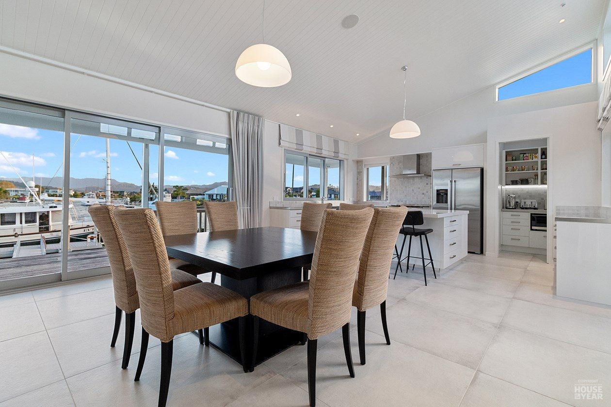 A gallery-style hallway draws the eye through to the expansive water views beyond. Overhead, tongue-and-groove timber ceilings follow the raking roofline, creating warmth and flow throughout the interiors. Clerestory windows, operated electronically, invite natural light, ensuring the home feels bright and airy year-round.