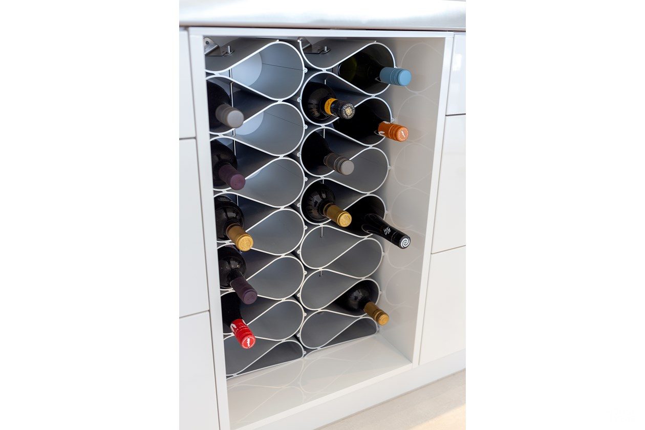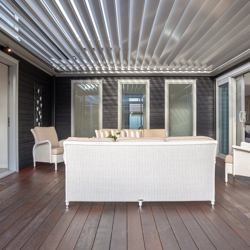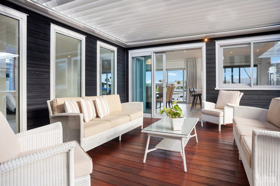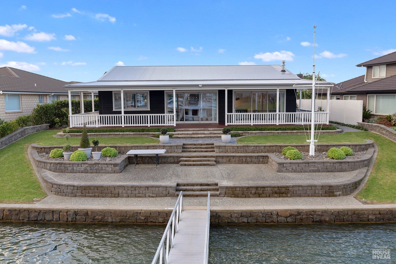 A gallery-style hallway draws the eye through to the expansive water views beyond. Overhead, tongue-and-groove timber ceilings follow the raking roofline, creating warmth and flow throughout the interiors. Clerestory windows, operated electronically, invite natural light, ensuring the home feels bright and airy year-round.